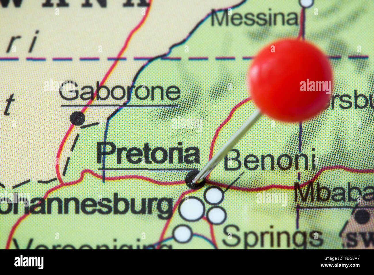 Close up of a red pushpin in a map of Pretoria, South Africa Stock